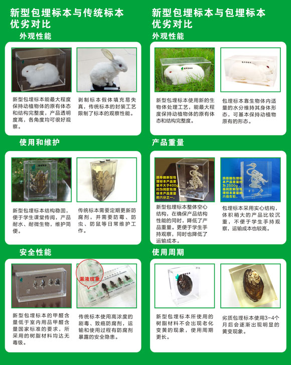 新型包埋標本產品概述 產品運用先進的動植物保色保形干燥工藝,采用高分子材料對干燥的生物體等標本材料進行滲透和包裹后,封裝制作而成的一種新型的包埋標本產品。產品為空心結構,輕便易觀察。標本真實自然,生物形態(tài)飽滿。是一種長期展示和非常便于教學的新型包埋標本。