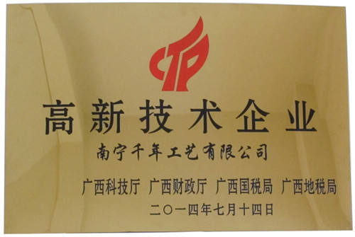 (本網(wǎng)訊) 熱烈慶祝集團(tuán)公司------千年工藝獲得了由廣西科技廳、廣西財(cái)政廳、廣西國(guó)稅局、廣西地稅局聯(lián)合頒發(fā)的“高新技術(shù)企業(yè)證書(shū)”,成為廣西2014年首批國(guó)家級(jí)高新技術(shù)企業(yè)之一。